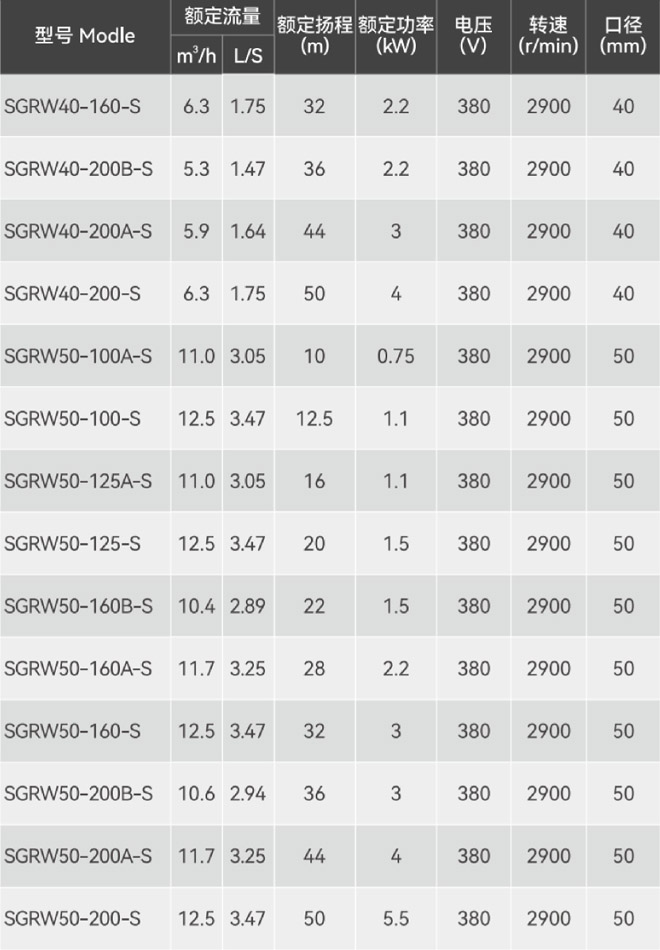 SGRW40-160-S不銹鋼臥式管道離心泵可供輸送清水及物理化學性質類似于清水的其他液體之用,適用于工業和城市給排水、高層建筑增壓送水、園林噴灌、消防增壓、遠距離輸送、暖通制冷等冷熱水循環增壓及設備配套、能源、治金、化工、紡織、造紙以及賓館、飯店等鍋爐熱水增壓輸送及城市采暖系統循環用泵,使用介質溫度T≤103℃。